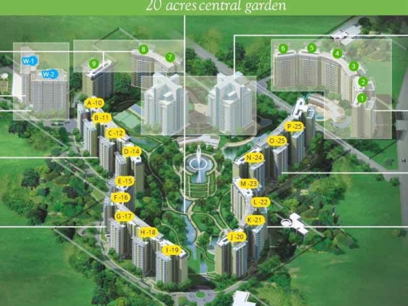 20‑acre greens / expansive open space: The gardens, central greenscape and large landscaping are a prominent feature to create a “resort‑feel” environment.